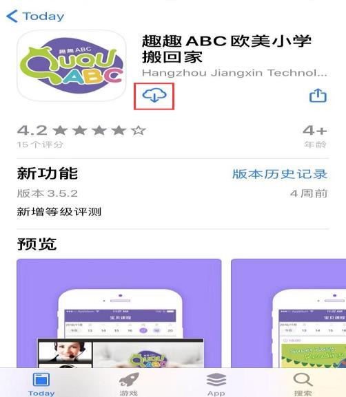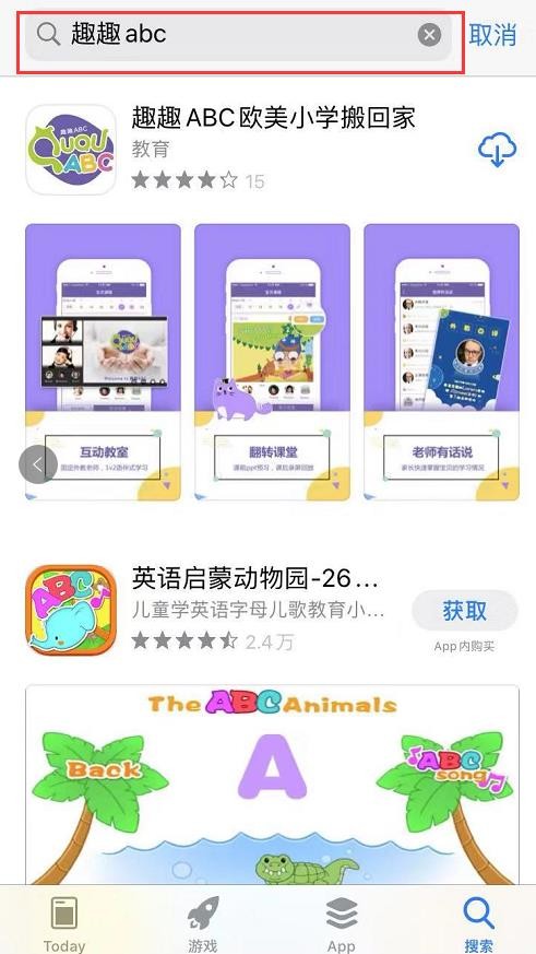1.打開 iPhone 端的 APP Store,輸入搜索“趣趣 ABC”(圖一),選擇趣趣ABC,進入下載頁面(圖二);