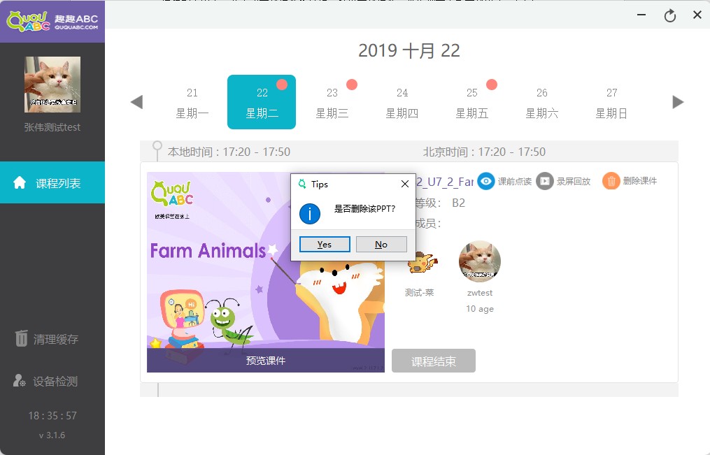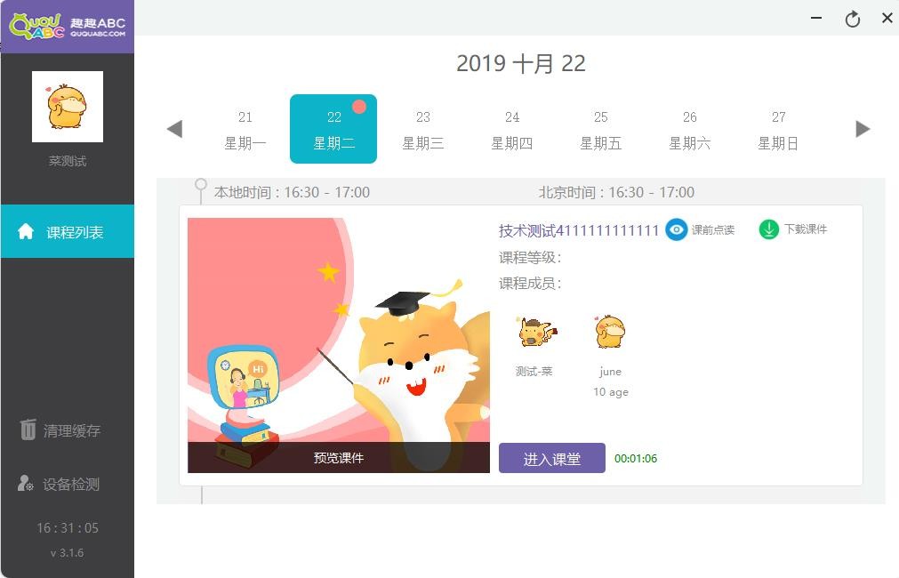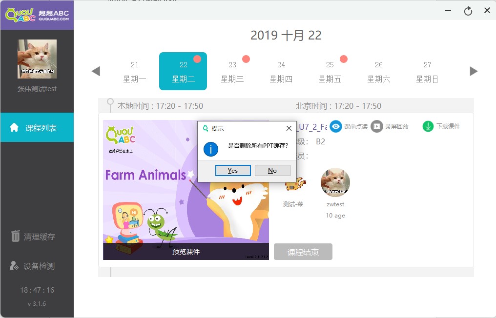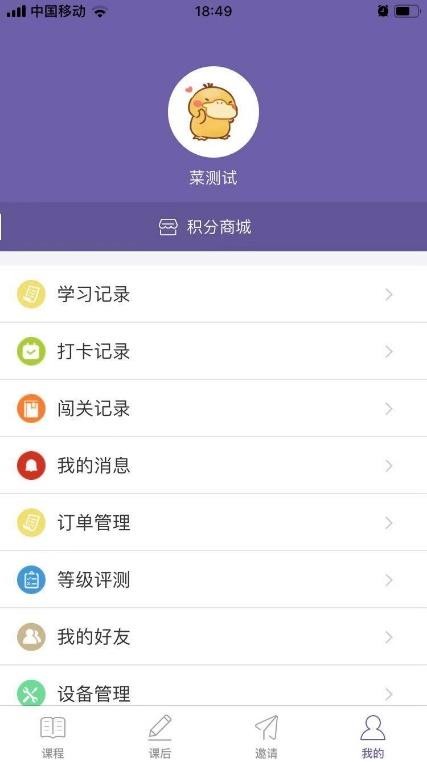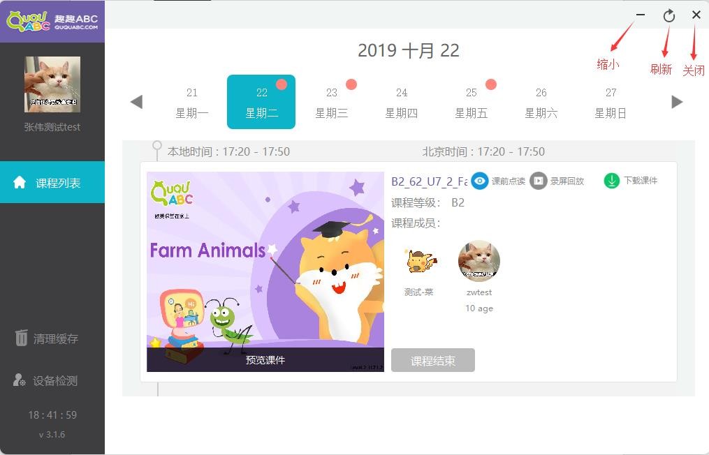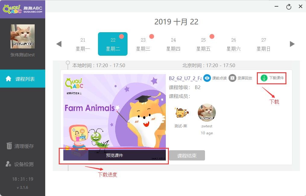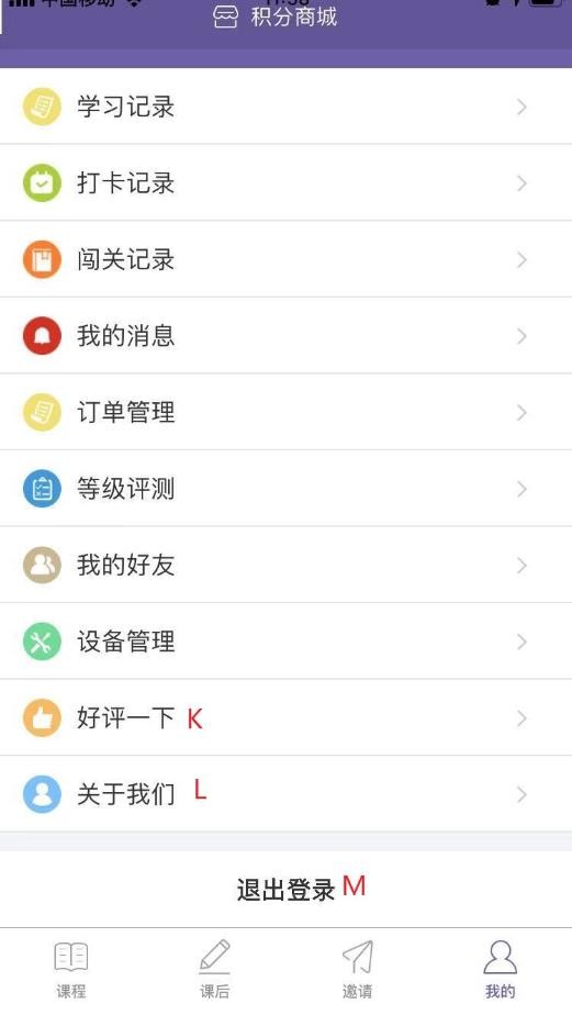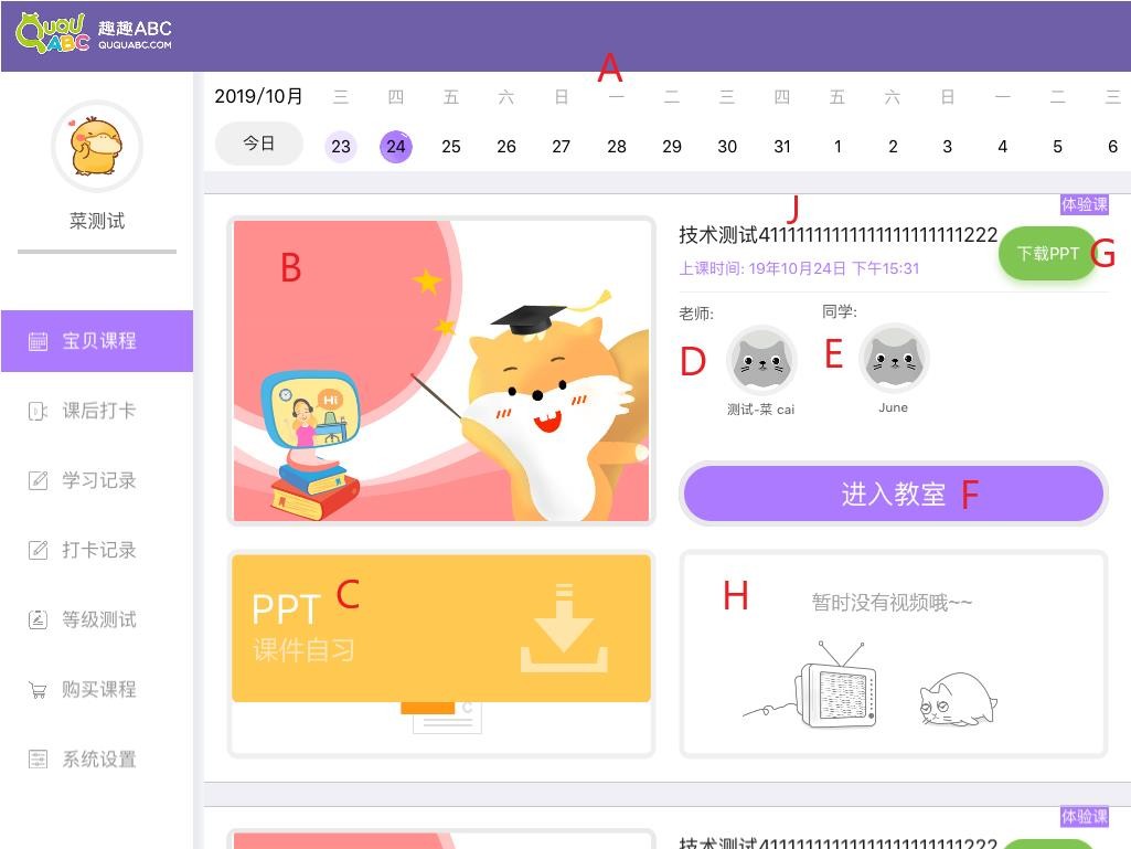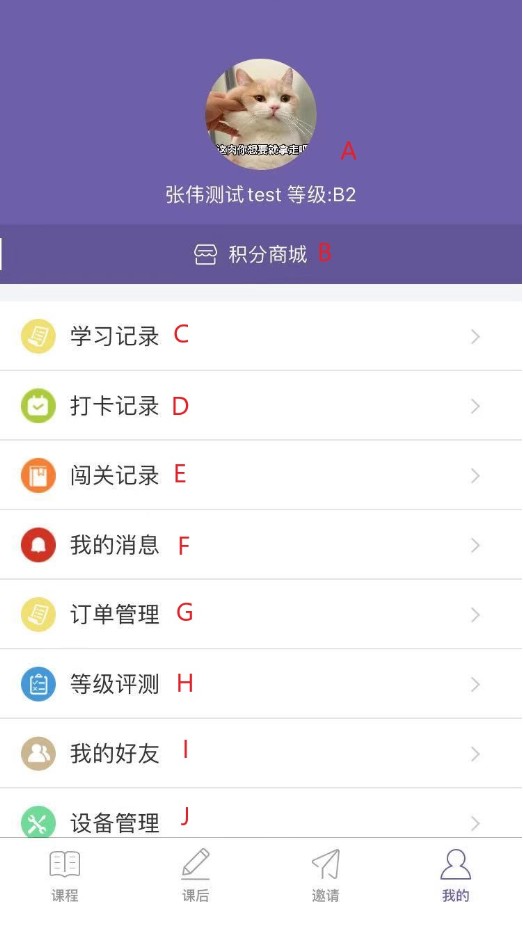 H:等級測評:體驗生可以進入等級測試,測試自己的課程等級并可以查看測試記錄。