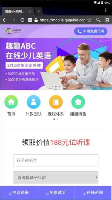 1.打開手機瀏覽器,輸入地址 https://mobile.ququkid.com/,回車確認,進入趣趣ABC