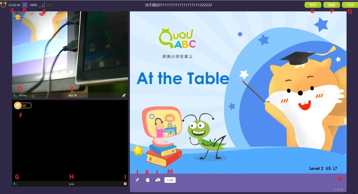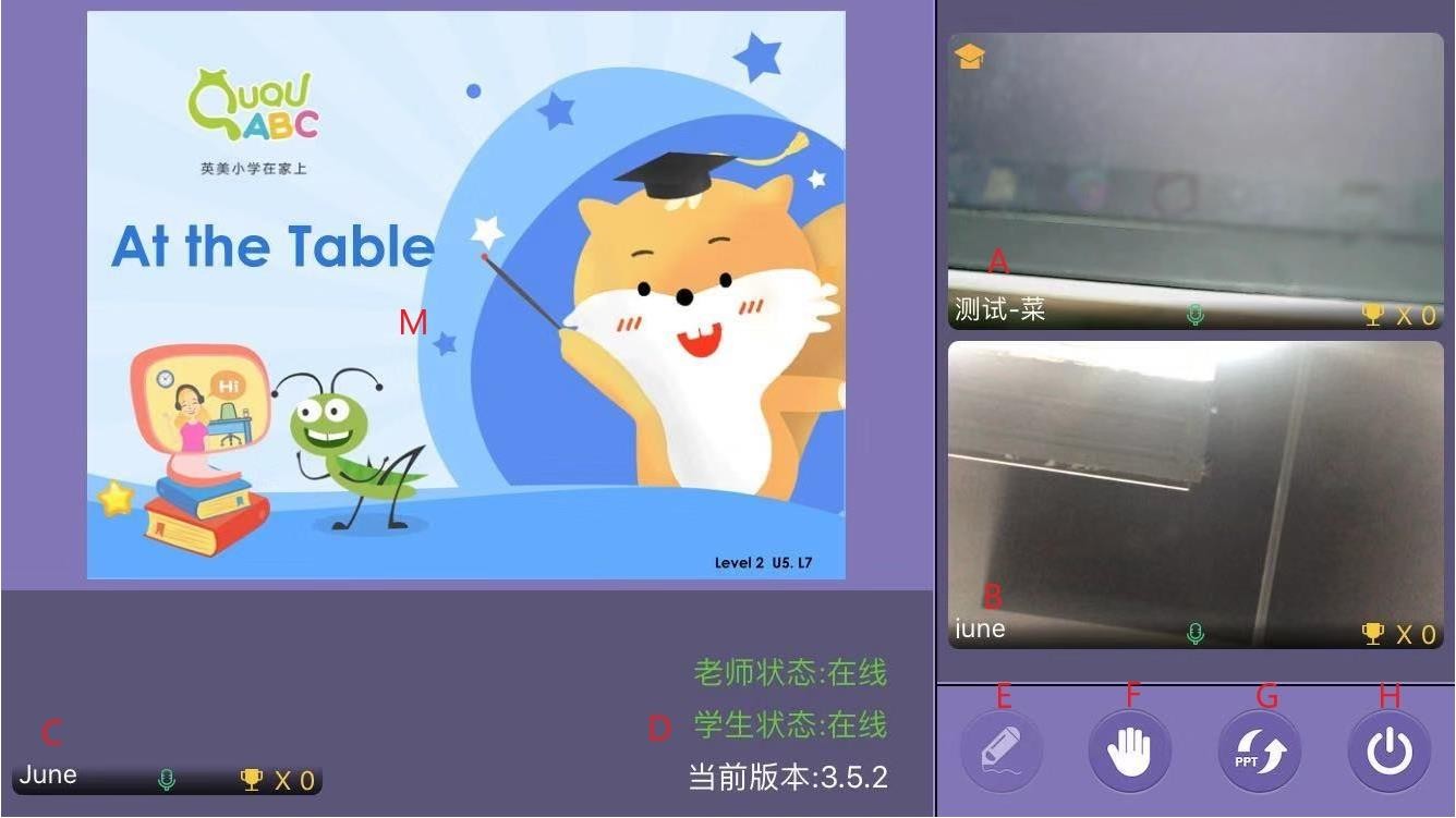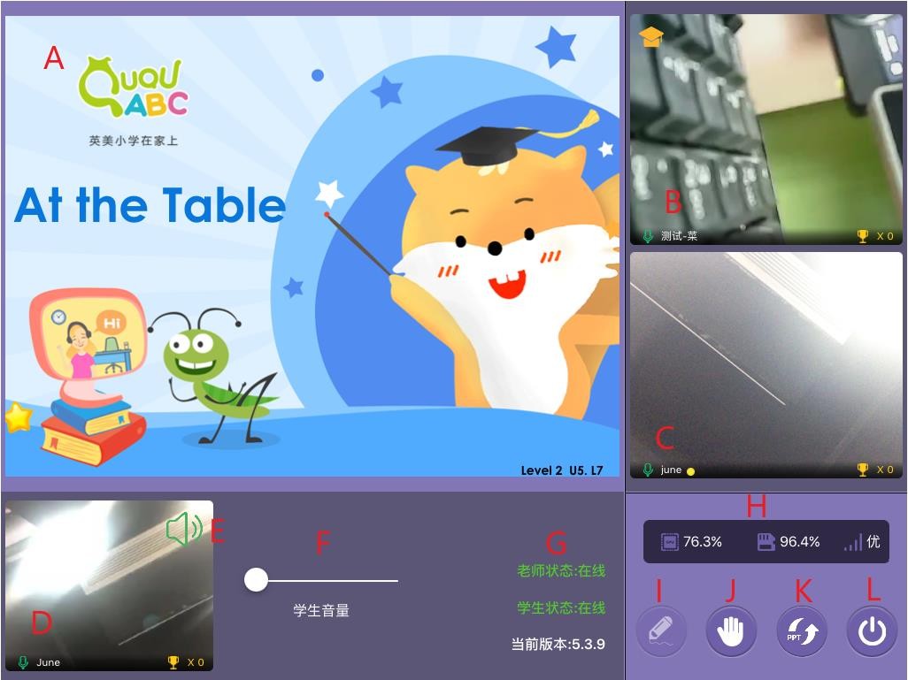 B:學生視頻框,顯示學生英文名,麥克風和獲得獎杯數。注:課堂需要授權攝像頭和麥克