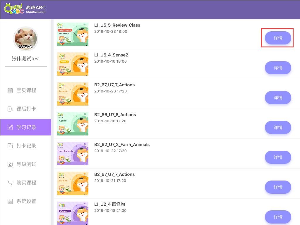 1.學習記錄,顯示當前學生的學習記錄,點擊“詳情”按鈕,可以查看該課程對應的課程詳情、PPT 和錄屏。