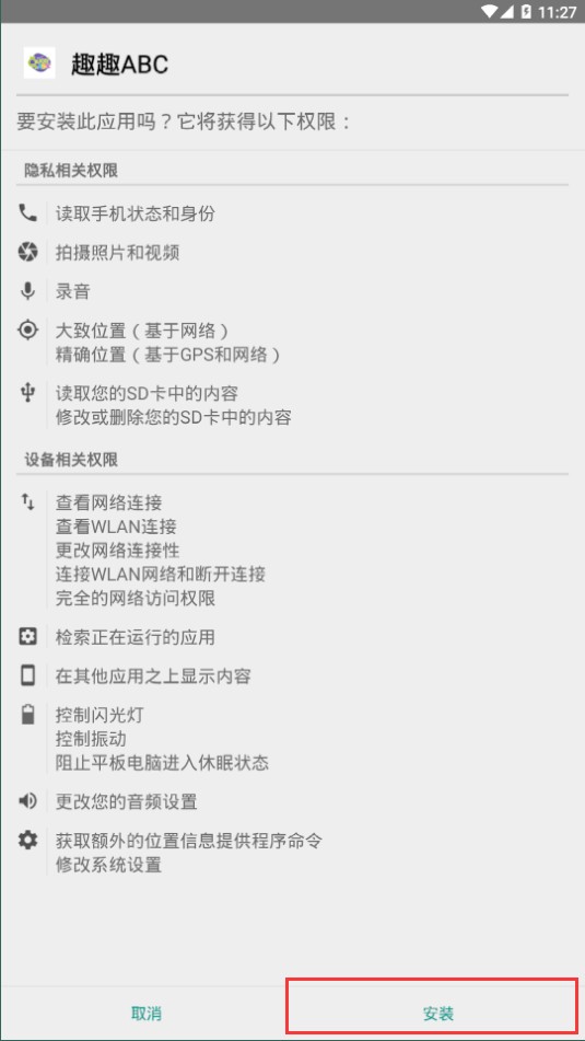 1.安裝包下載完成,點擊“安裝”按鈕,進入安裝界面,授予權限后,點擊安裝,等待軟件安裝完成,軟件安裝完成,手機上會出現一個趣趣 ABC 的應該圖標。