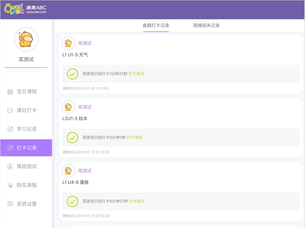 打卡記錄:分為音頻打卡記錄和視頻闖關記錄。