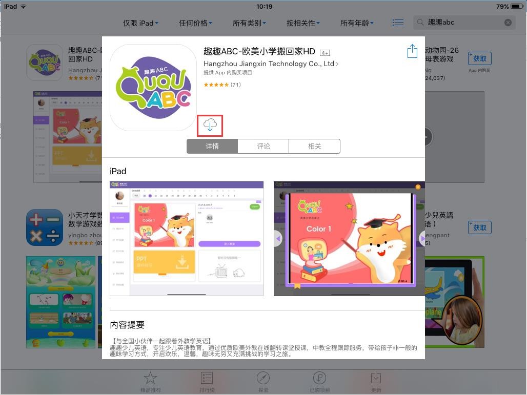 1.打開 iPad 端的 APP Store,輸入搜索“趣趣 ABC” (下圖一),選擇趣趣ABC,進入下載頁面(下圖二);