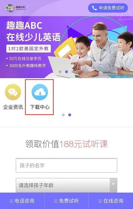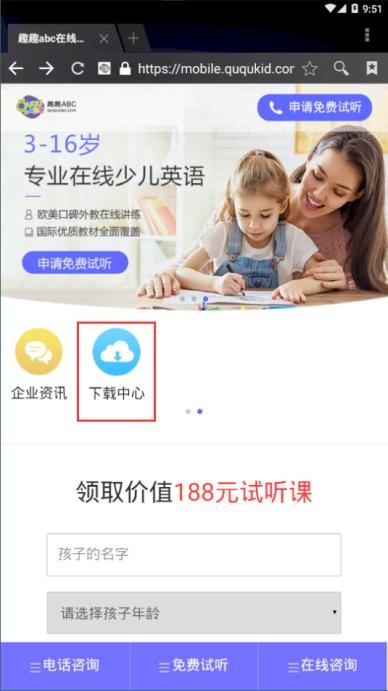 1.打開手機瀏覽器,輸入地址 https://mobile.ququkid.com 回車確認,進入趣趣》ABC移動端官網(下圖一);