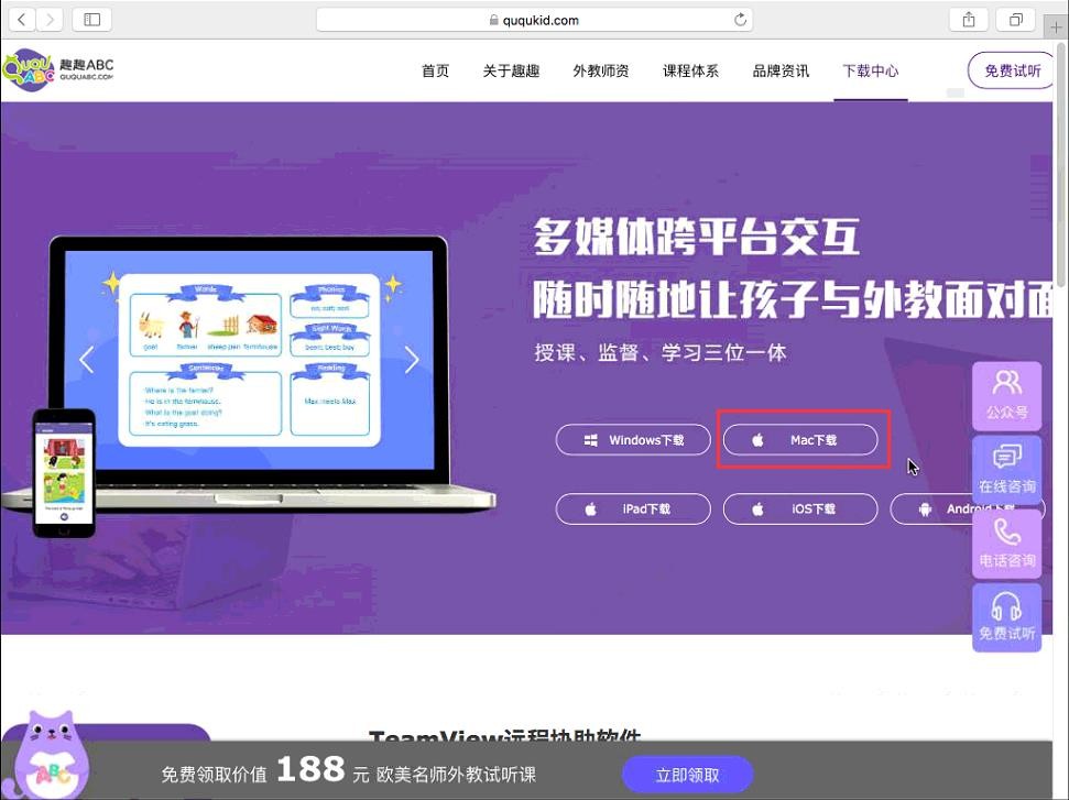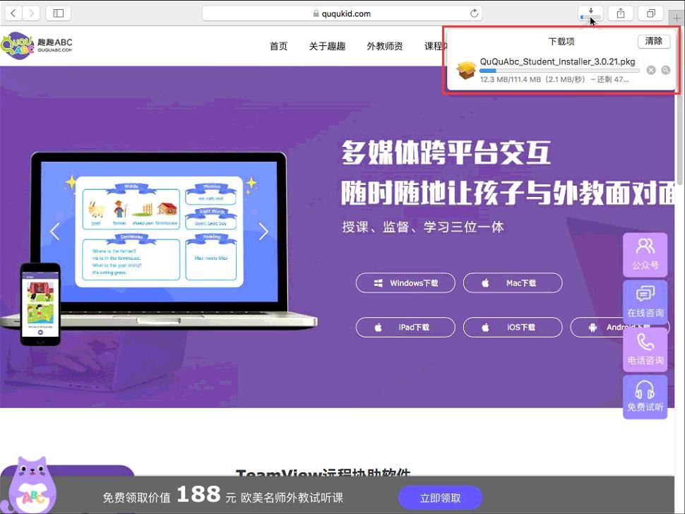 1.打開瀏覽器,輸入地址:http://www.ququkid.com 或點擊趣趣ABC官網,回車確認,進入趣趣 ABC 官網;注:這里以 Safari 瀏覽器為例