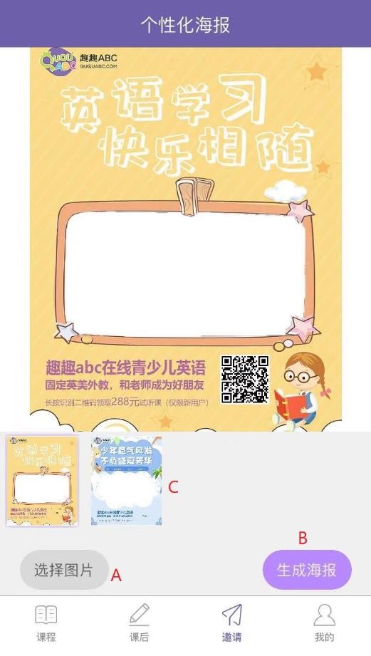 B:生成海報,圖片選擇完成,點擊生成海報按鈕,可以生成一張定制海報,海報可以分享好友和朋友圈。