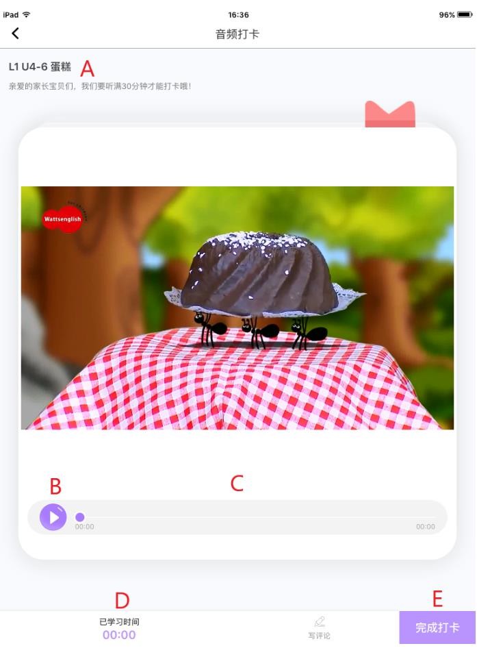 1.學生通過聽取音頻或查看視頻進行打卡,打卡時長為 30 分鐘,當小于 30 分鐘時,無法提交打卡;
