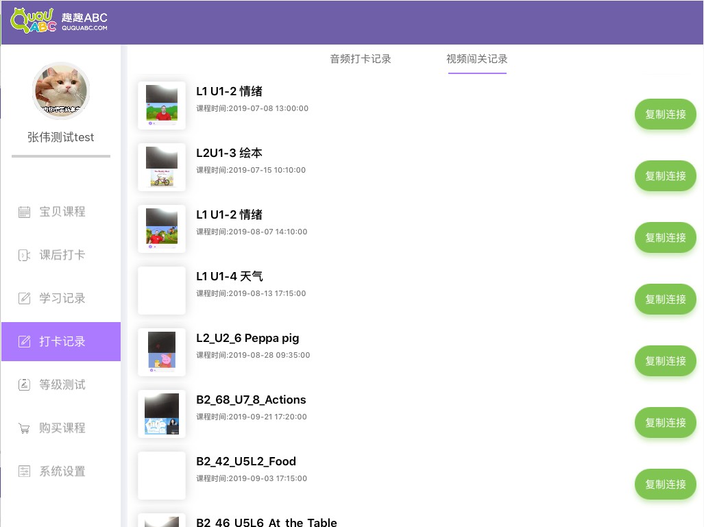 1.視頻闖關記錄界面,顯示所有視頻闖關的記錄,包含:闖關課程、課程時間。點擊圖標,可以播放闖關記錄;點擊復制按鈕,可以復制鏈接,對闖關記錄進行分享。