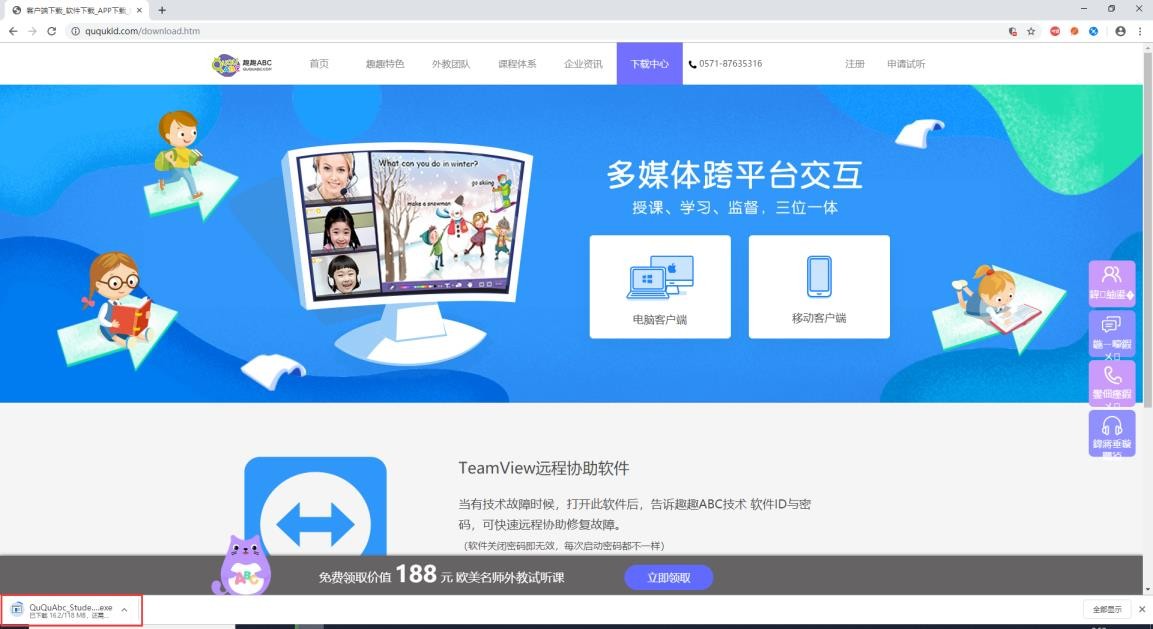 2.選擇電腦客戶端,單擊下載 Windows 客戶端,觸發下載,如圖,等待下載完成,下載完成可以在下載文件里看到一個 QuQuAbc_Student_Installer_版本號.exe 的安裝包。