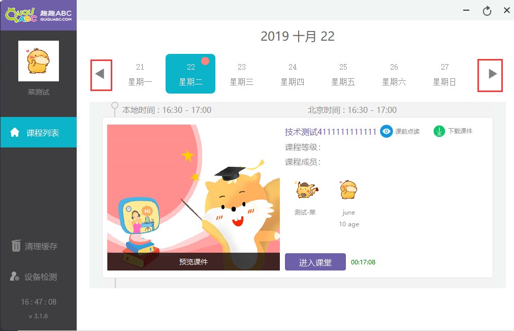 1.課程列表界面,單擊“<”按鈕,可以查看課程歷史記錄,可以查看前 8 周歷史記錄;單擊“>”按鈕,可以查看下周的課程列表。