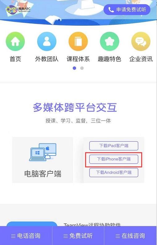 3.選擇移動客戶端,單擊下載 iPad 客戶端,界面彈出跳轉到 App Store提示,點擊確認,跳轉到 App Store,點擊下載按鈕,即可下載趣趣 ABC iPad 客戶端。