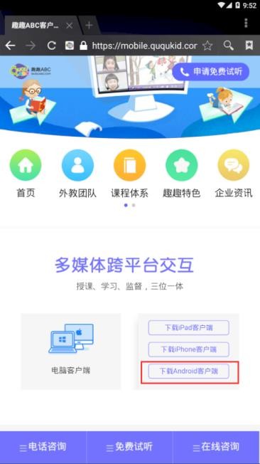 3.選擇移動客戶端,單擊下載 Android 客戶端(下圖一),界面彈出跳轉到應該商店提示(下圖二),點擊確認,跳轉到應用商店(下圖三),點擊普通下載按鈕,即可下載趣趣ABC Android 客戶端。