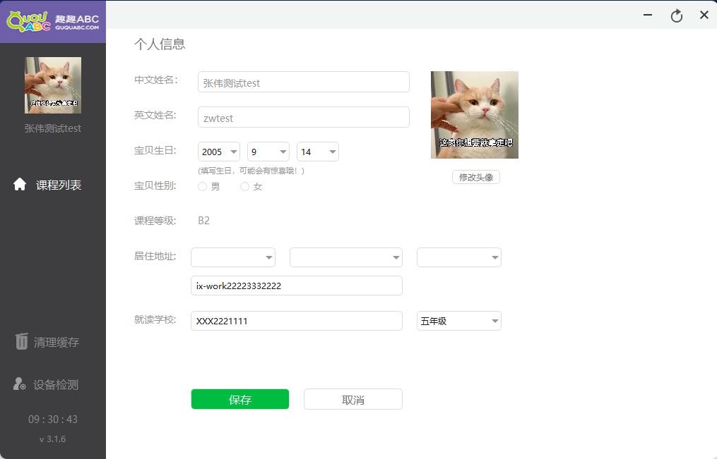 A:個人資料,顯示學生的個人資料,包含頭像、姓名、性別、生日等一些個人信息。